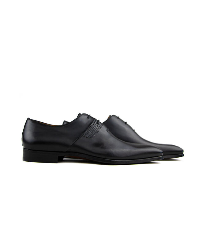 Prachtige tijdloze zwart leren Magnanni veterschoenen voor de mannen. Ze zijn handgemaakt en uitgevoerd met een prachtig bewerkte inzet op de zijkant, een prachtige belijning bovenlangs en een gedeeltelijk leren zool. Je voelt de schoenen amper aan de voeten door de sublieme pasvorm. Het zwart maakt dat je de veterschoenen met vrijwel alles kunt combineren.