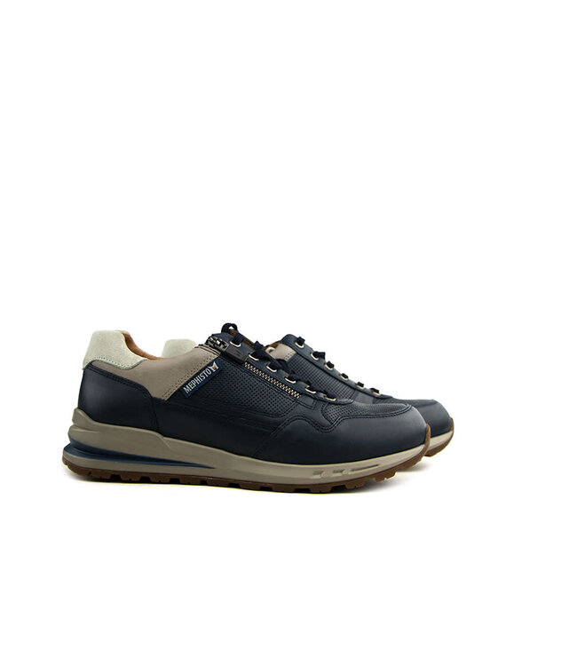 Blauw leren Mephisto sneakers voor de sportieve heren. Ze hebben een mooi lagenspel, een taupe leren bovenrand, grijs suède vlakken, een perforatiemotief en een grijs rubberen zool. Je trekt ze makkelijk aan met de extra rits op de zijkant en draagt ze met veel plezier door de gewatteerde elementen en de goede pasvorm. Het uitneembare voetbed maakt dat je de sneakers ook kunt dragen met steunzolen. De kleur maakt ze tijdloos en makkelijk te combineren.