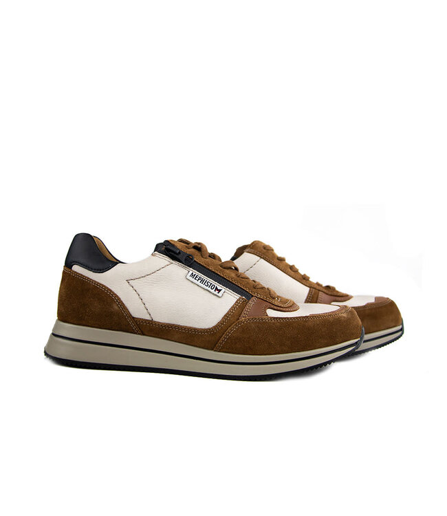 Sportieve cognac suède Mephisto Gilford sneakers. Deze comfortabele stappers zijn voorzien van offwhite leren inzetten met een fijne print, een blauw leren hiel en een beige zool met blauwe belijning rondom. Je trekt de sneakers gemakkelijk aan door de rits aan de zijkant. De gewatteerde elementen, stevige zool en sublieme pasvorm. Extra fijn is het uitneembare voetbed zodat je de sneakers met steunzolen kunt dragen. Een frisse kleurcombinatie die je gemakkelijk kunt matchen met je voorjaarsgarderobe.