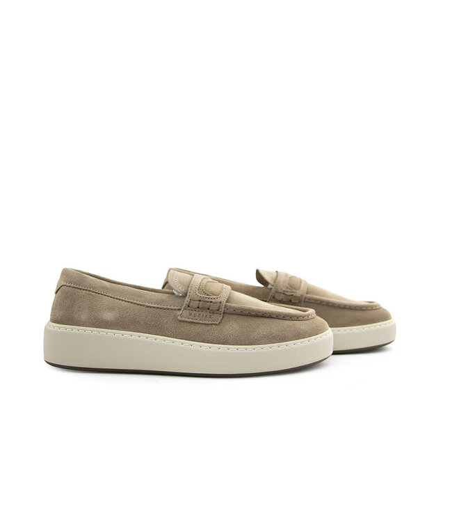 Het bovenwerk is uitgevoerd in beige suède, een frisse en veelzijdige kleur die moeiteloos combineert met lichte jeans, chino’s of zomerse pantalons. Het leren bandje over de wreef geeft de loafer een klassieke touch, terwijl de doorgestikte neus zorgt voor extra karakter en een nonchalante uitstraling. De dikke, rubberen sneakerzool maakt het geheel helemaal van nu. Dit is geen standaard instapper, maar een krachtige mix van loafer en sneaker die zorgt voor een sportieve, relaxte look met stijl.