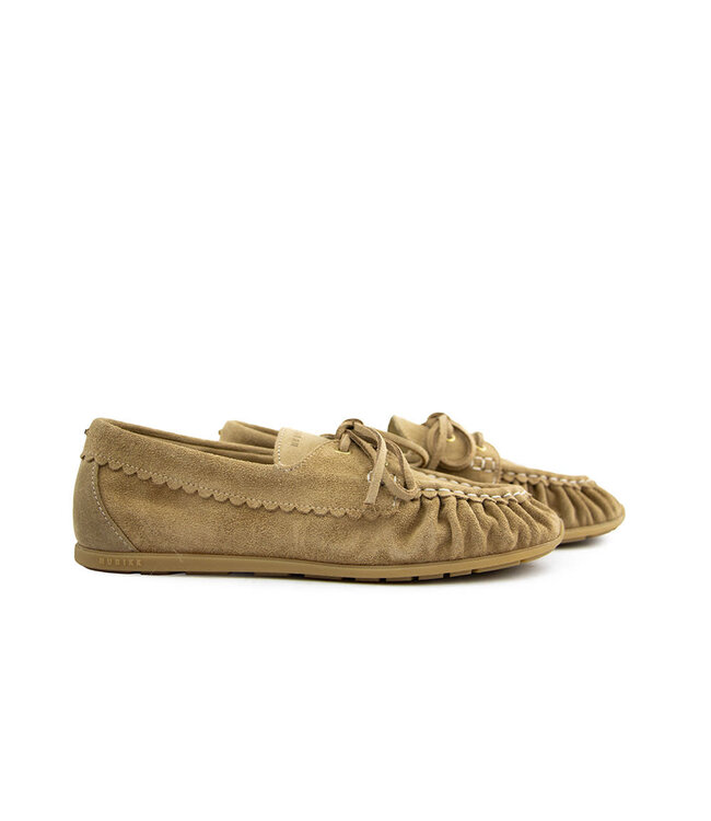 Deze Nubikk Riley dames loafers zijn speels, stijlvol en comfortabel tegelijk. Het beige suède geeft de schoen een zachte, luxe uitstraling, terwijl de spiegelnaad en geplooide neus het klassieke loaferkarakter benadrukken.