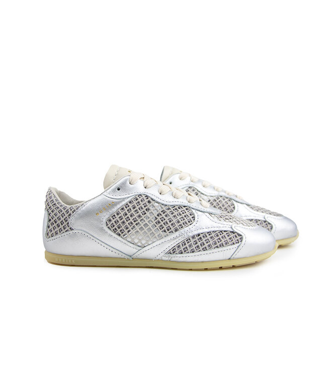 Nieuw in de Nubikk-familie: de Riley Morgan dames sneakers. Deze metallic zilveren leren sneakers springen direct in het oog met hun unieke, gevlochten honingraatmotief. De beige leren tong en bijpassende veters zorgen voor een stijlvol contrast, terwijl de gedeeltelijk leren en textiele voering zacht aanvoelt aan je voet. De slanke rubberen zool maakt het geheel licht en soepel – perfect voor elke dag met nét dat beetje extra flair.