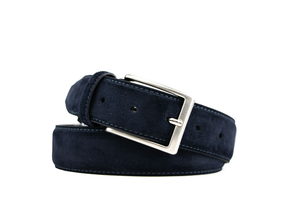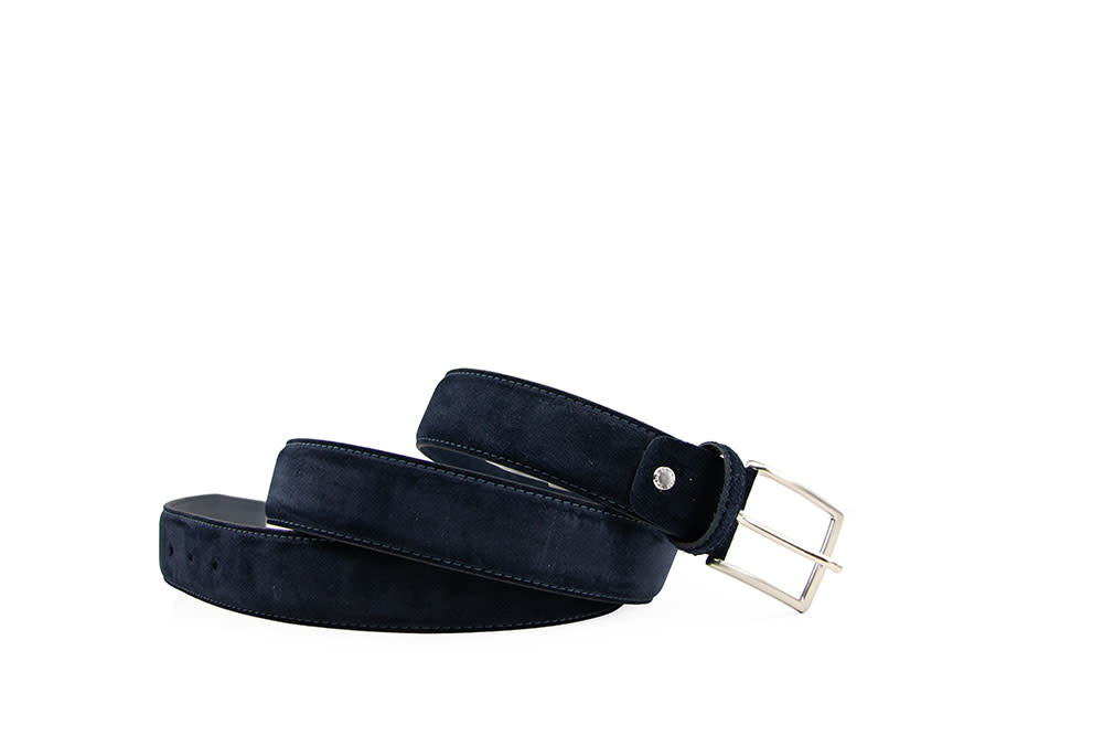 Donkerblauwe Officine Napoli herenriem van zacht suède, afgewerkt met een luxe uitstraling en verfijnd vakmanschap. De riem is voorzien van een donkerblauwe leren voering met subtiele logo-accenten, wat zorgt voor een stijlvolle ton-sur-ton look en extra duurzaamheid. De prachtige stikwerk belijningen benadrukken de elegante en tijdloze kwaliteit van deze riem.