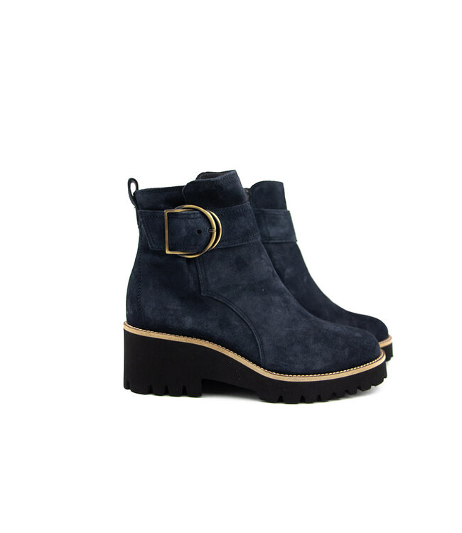 Deze stijlvolle enkellaarzen van Paul Green zijn een echte blikvanger. Het donkerblauwe suède wordt elegant gecombineerd met een opvallende koperkleurige gesp op de zijkant. De verfijnde stikselbelijningen en de doorgestikte houtlook zoolrand geven de laars een subtiele western touch, terwijl de stevige hak – slim gecompenseerd door de robuuste profielzool – zorgt voor een stabiele en comfortabele pasvorm.