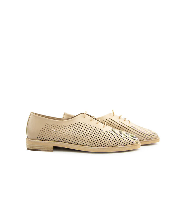 Deze prachtige Pertini dames veterschoenen ademen de charme van de jaren ’30. Het beige leer is volledig voorzien van verfijnde perforaties, waardoor de schoenen luchtig en zomers aanvoelen. Het unieke ontwerp heeft geen tong, waardoor de veterlijst openvalt en het model een speels en elegant karakter krijgt.