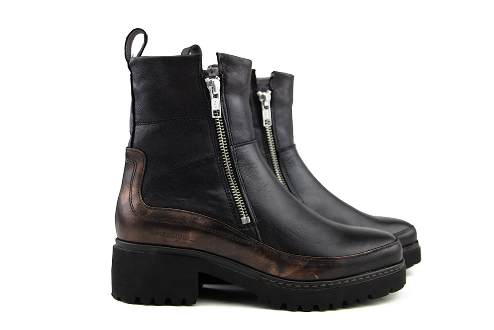 Stoer en stijlvol tegelijk – dat zijn de Coco 09.02 bikerboots van Piedi Nudi. Het zwarte leer wordt prachtig gecombineerd met een bronskleurige band over de zij- en achterkant, voorzien van een subtiele antraciet metallic finish. Dit geeft de boots net dat vleugje luxe dat ze onderscheidt van de klassieke biker.