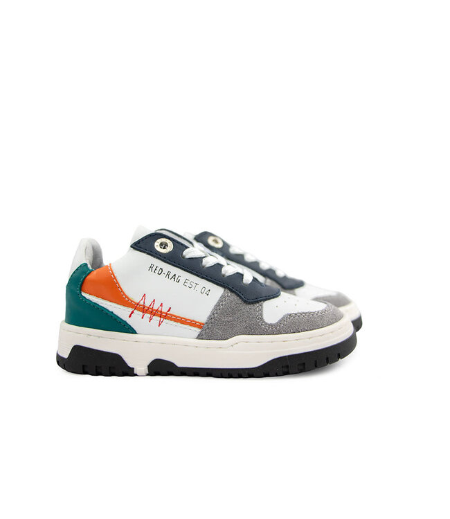 Deze Red Rag jongens sneakers zijn gemaakt voor jongens die houden van een stoere en opvallende look. De witte leren ondergrond wordt gecombineerd met een grijs suède neus en een blauw leren vetervlak, wat zorgt voor een frisse en sportieve basis.
