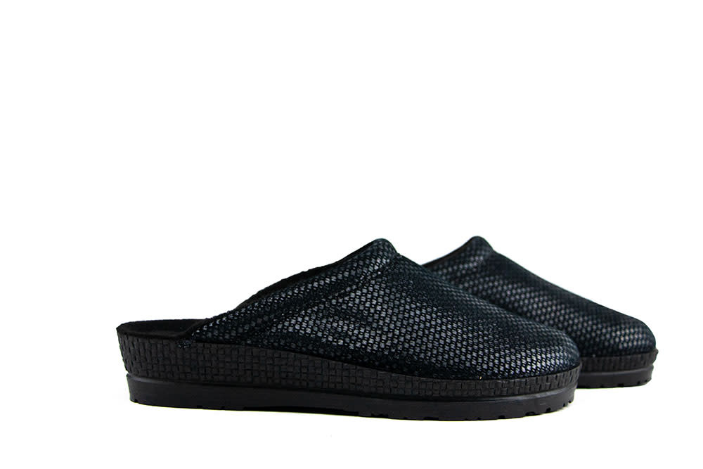 Stijlvolle zwarte Rohde damesmuilen voor bij huis met een print, metallic finish en een subtiele geblokte sleehak. Je schiet ze gemakkelijk aan en ze zitten als gegoten aan de voeten door de goede pasvorm, stevige zool en zachte materialen. Met deze muilen heb jij in en om het huis geen koude voeten meer. De rubberen zool gaat een mooie tijd mee, waardoor je makkelijk even naar buiten loopt om de vuilnis weg te brengen.