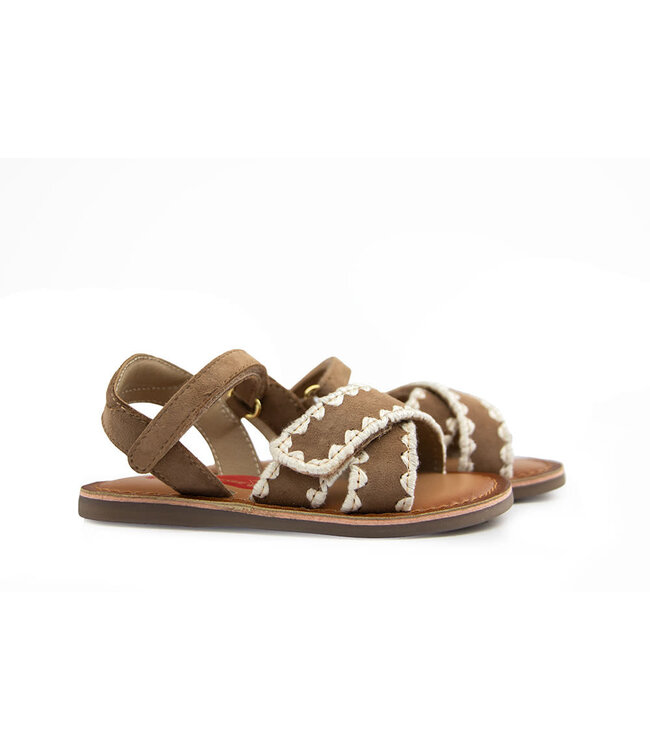 Deze Shoesme meisjes sandalen zijn perfect voor zonnige dagen vol avontuur. Het bovenwerk van taupe suède geeft de sandaal een rustige en stijlvolle uitstraling, terwijl de geborduurde stiksels op de banden bij de tenen zorgen voor een speels en uniek detail.