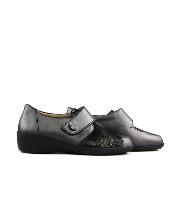Stijlvolle grijs leren Solidus klittenbandschoenen voor de dames. Ze hebben een opvallende metallic finish, een schuinlopende band naar de tong met een speelse print en een mooie sierknoop op de zijkant. De J wijdte, lichtgewicht zool en de fijne pasvorm maken de schoenen een genot aan de voeten. Je trekt ze gemakkelijk aan met de klittenband, hiermee kun je ook zelf bepalen hoe strak de schoenen zitten. Door het uitneembare voetbed kun je ze ook dragen met steunzolen. Het geheel ziet er door de metallic finish chique uit.