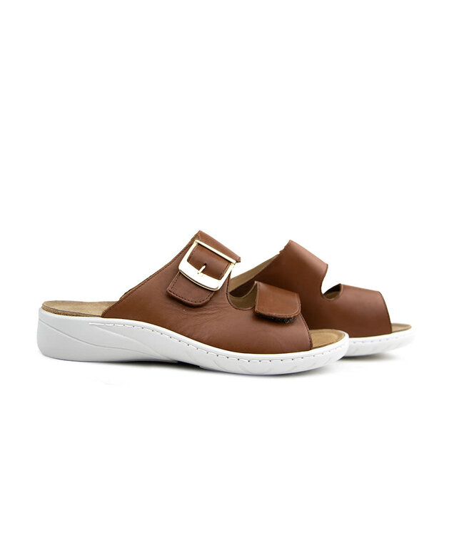 Sportieve cognac leren Solidus damesslippers met brede wreefbanden en een zilver kleurige siergesp. Je schiet de slippers met veel plezier aan door de stevige zool, goede pasvorm en G wijdte. Extra fijn is de mogelijkheid om ze met steunzolen te dragen. Het klittenband maakt dat je ze net wat strakker of losser kunt doen. Volledig leer gevoerd en gemakkelijk te combineren door het cognac.