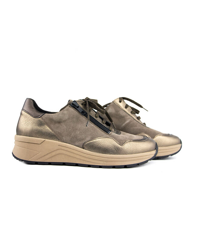 Deze taupe suède Solidus Karma sneakers zijn een must-have voor de dames die comfort willen combineren met stijl. Ze hebben metallic brons leren accenten, glitterveters en een beige zoolrand. Je schiet de sneakers gemakkelijk aan met de rits op de zijkant. De gewatteerde elementen, stevige zool en sublieme pasvorm geven een hoog draagcomfort. Extra voordelen zijn de ruimte voor een steunzool en de K wijdte. Een sportieve touch aan je najaarslook.