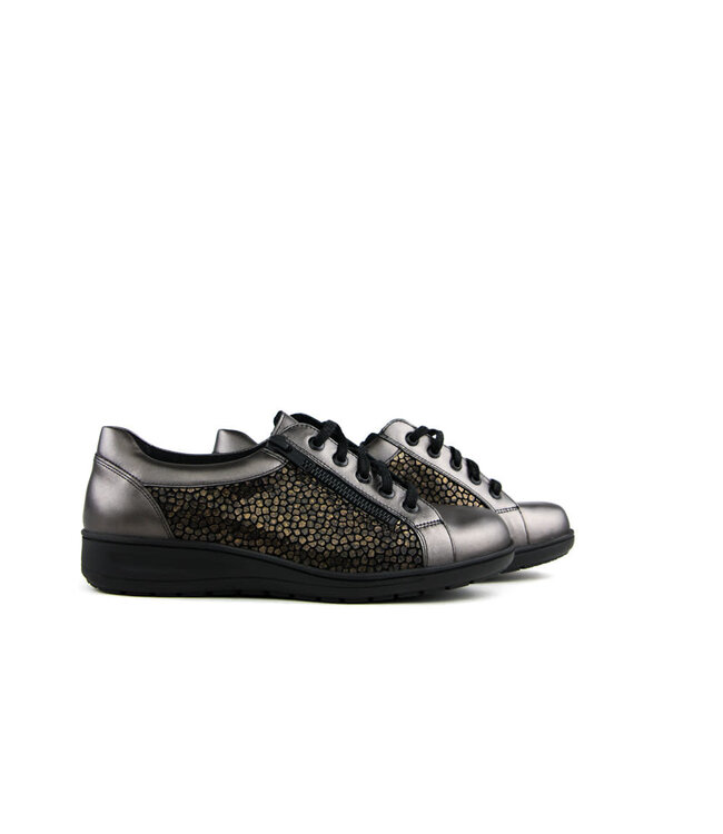 Deze opvallende grijs leren Solidus veterschoenen zijn een absolute aanwinst voor je najaars garderobe. Ze hebben een metallic finish, een print op e zijkant, zwarte veterringen en donkere glitterveters. Aantrekken is gemakkelijk met de rits op de zijkant. Aan de voeten zitten de veterschoenen fantastisch door de lichtgewicht materialen, de stevige zool en goede pasvorm. De K wijdte maakt dat je ook met bredere voeten deze schoenen kunt dragen. Het geheel is stylish, opvallend en helemaal najaar proof.