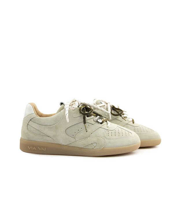 Deze Via Vai Nila Macy dames sneakers zijn een echte blikvanger dankzij hun unieke ontwerp. Het grijze suède bovenwerk is voorzien van subtiele perforaties en verschillende lagen, wat zorgt voor een speels en stijlvol effect. De offwhite leren omslag op de tong en het hielvlak geeft het model een frisse, contrasterende touch.