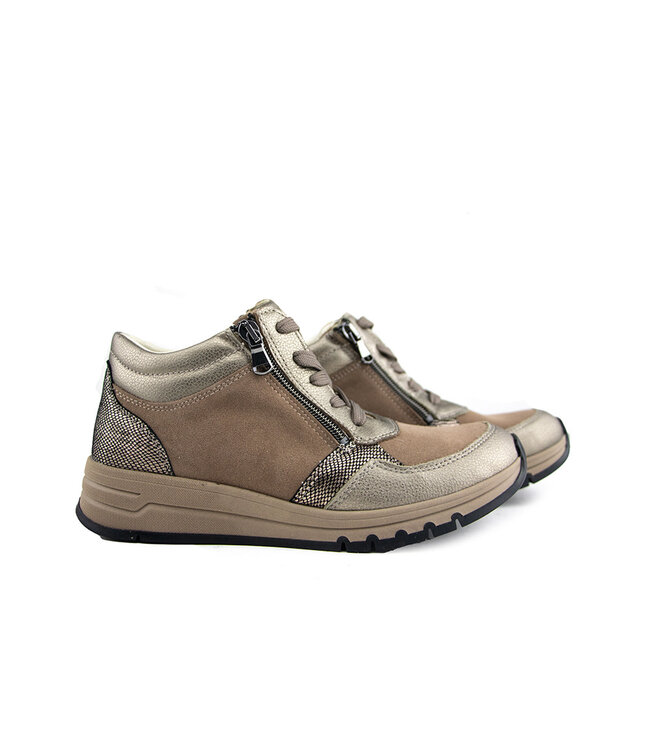 Op zoek naar comfort én een trendy look? De Waldläufer Apriol hoge sneakers combineren het beste van twee werelden. Gemaakt van taupe suède, afgewerkt met metallic goud leren accenten en een subtiele print. De gewatteerde tong en bovenrand zorgen voor extra zachtheid rondom de enkel. Dankzij de dubbele rits én vetersluiting trek je ze makkelijk aan en uit. De sneaker is voorzien van een uitneembaar voetbed, H wijdte en een stevige rubberen zool. De combinatie van leren en textiele voering zorgt voor een prettig draaggevoel – ook op lange dagen.