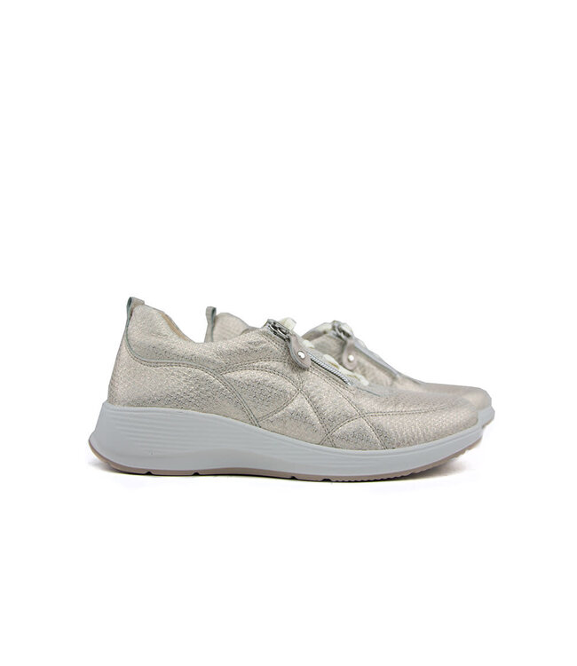 Deze modieuze veterschoenen van Waldläufer zijn uitgevoerd in platina goud leer met een subtiele all-over print. De vetersluiting in combinatie met ritsen aan beide kanten van de veterlijst zorgt voor een makkelijke instap. Dankzij de leren voering, het uitneembare voetbed en de extra brede leest (wijdte K) bieden deze schoenen optimaal comfort. De rubberen loopzool zorgt voor een goede demping en grip. Perfect voor wie stijl en draaggemak wil combineren!