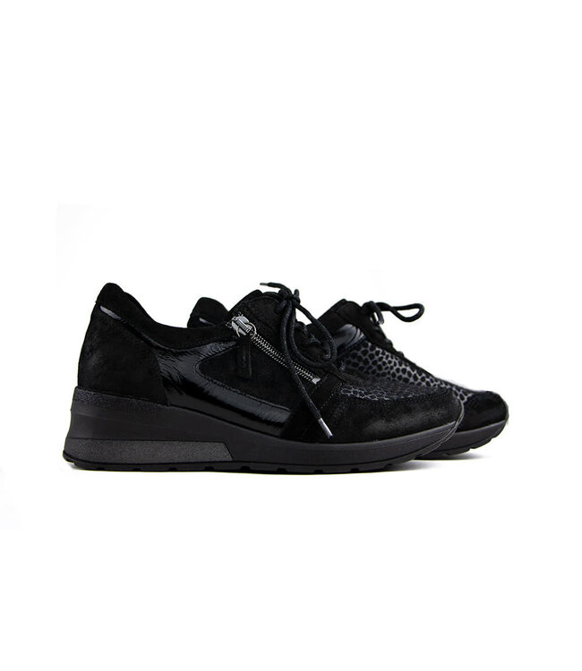 Stoere en stylish zwart suède Waldläufer sneakers voor de dames met een iets bredere voet. Ze hebben een giraffenprint op de wreef, een lakleren inzet op de zijkant en een subtiele glitter finish in de veters. Je schiet de sneakers gemakkelijk aan met de rits, je hoeft de veters eigenlijk niet te gebruiken. De gewatteerde elementen, fijne materialen en super pasvorm maken de Waldläufers een genot aan de voeten. Extra tof is dat de sneakers ook met steunzolen te dragen zijn en ze een H wijdte hebben. Het zwart zorgt ervoor dat je de schoenen heel makkelijk kunt combineren.