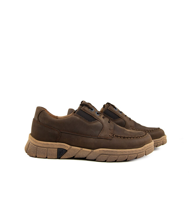 Het bruine nubuck leer met grove spiegelnaad en verfijnde stikwerk belijningen geeft de schoen een robuuste en toch verzorgde look. De metalen veterringen en elastische inzetten aan beide kanten zorgen voor een gemakkelijke instap en een goede pasvorm. De stevige rubberen zool maakt deze schoenen geschikt voor dagelijks gebruik, terwijl de H-wijdte extra ruimte biedt voor een comfortabele fit.