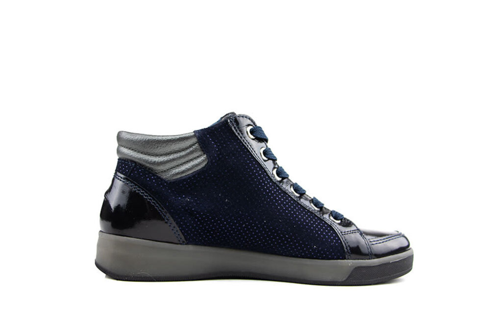 High sneaker from the brand Ara. The sneakers are made of dark blue suede with metallic accents and patent leather accents. The suede features small dot detailing. The sneakers have laces and a zipper on the side, on the outside.
