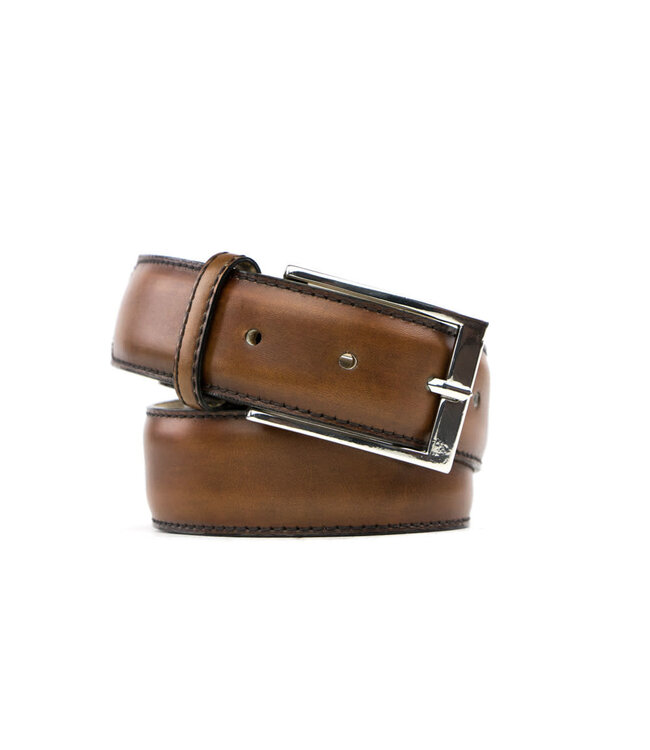 This cognac leather Berwick belt is a must-have for stylish men. It has a sublime and unique polish and finely finished stitching along the edges. The silver-tone buckle completes the look. The lining is done in beige leather with the Berwick logo incorporated.The belt can be ordered in different sizes but you can also have it customized. The whole is timeless, chic and easy to combine.