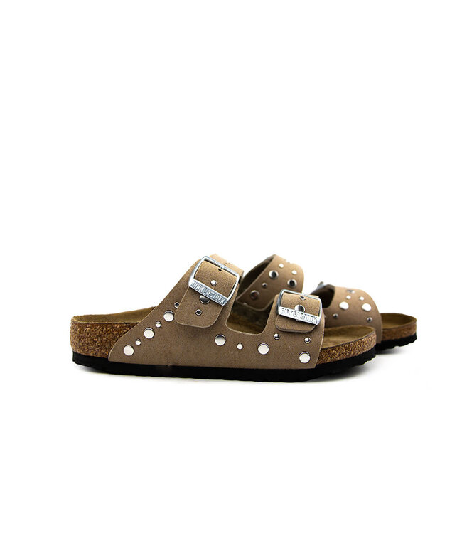 These Birkenstock girls sandals combine comfort with a bold, trendy look. The taupe suede upper is enhanced with eye-catching studs and chunky silver buckles, creating a true fashion statement.
