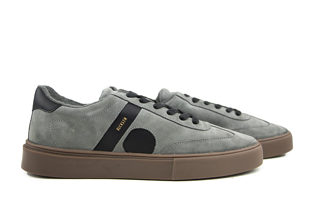 These grey suede Blackstone sneakers combine modern style with practical comfort. The upper is crafted from soft suede, featuring a black leather heel panel and subtle leather accents on the sides. Black laces and gold-toned logo details give the sneakers an elegant, sporty look, while the sturdy brownish rubber sole ensures excellent grip.