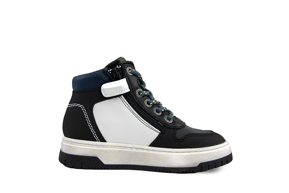 These colorful high-top sneakers from Develab are made to stand out! Featuring a cool mix of grey suede with perforated detailing, black printed leather overlays, a white leather base, and a striking lightning bolt – these sneakers bring serious style. Add in the blue leather collar and multicolored laces, and you’ve got one awesome pair of kicks.