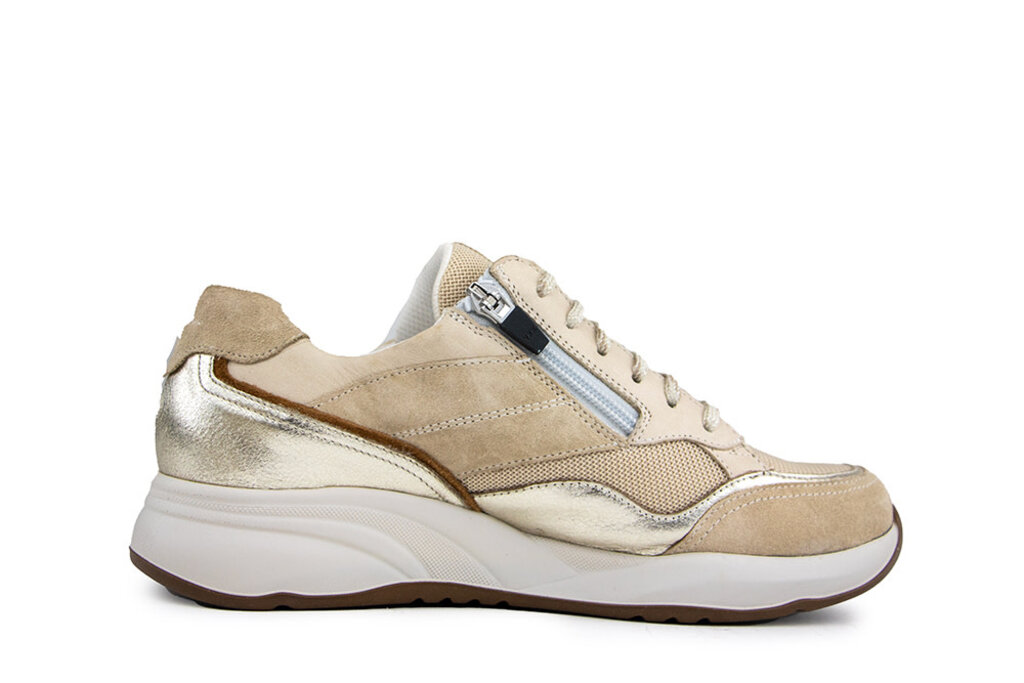 These light taupe suede Durea sneakers combine elegance with optimal comfort. The metallic accents and cognac suede lining on the side give a refined look. Thanks to the K-width, these sneakers offer extra room for a perfect fit. The convenient zipper closure makes them effortless to slip on and off, while the textile lining and removable footbed ensure a comfortable wear.