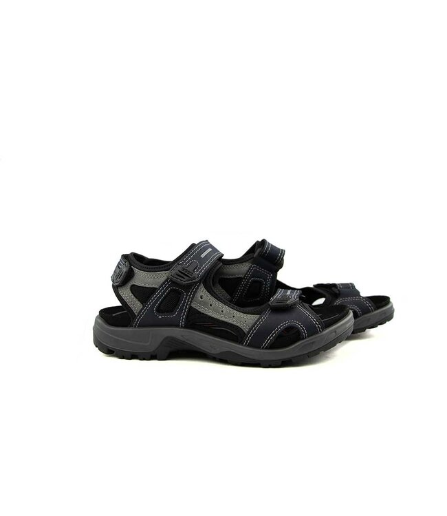 Sporty gray-blue nubuck leather Ecco men's sandals. They have perforations on the side, a nice interplay of colors, and a gray and black sole. It is not difficult to put them on with the three velcro straps. On the feet, the sandals are a delight with the soft sides on the ankles, good fit, and sturdy soles.