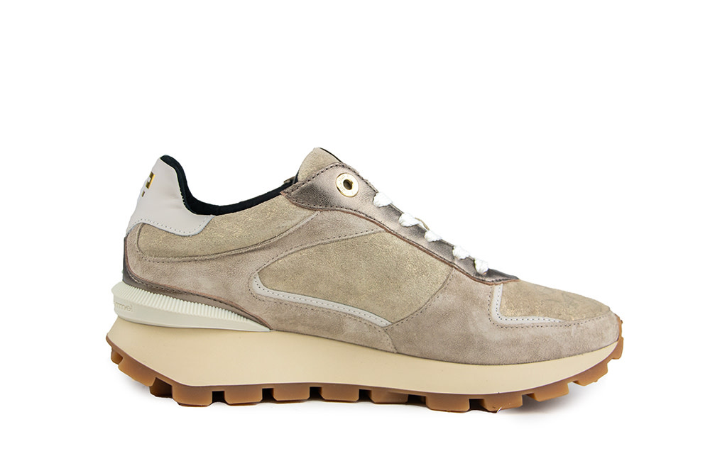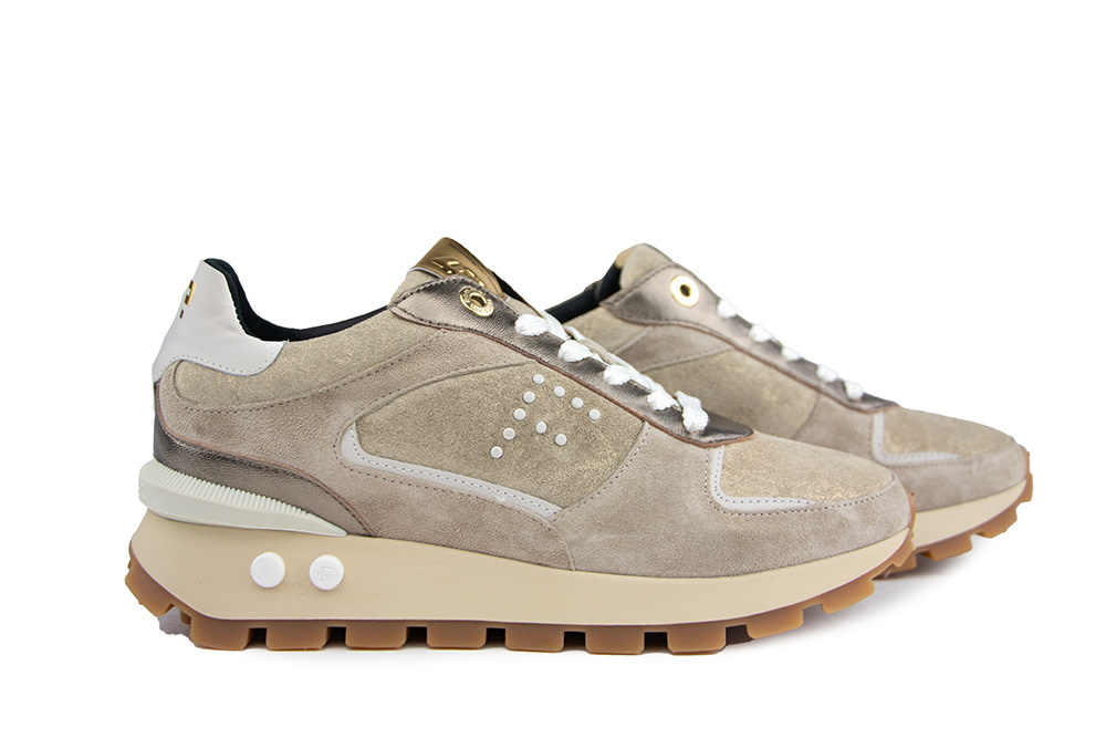 These taupe suede sneakers from Floris van Bommel combine bold design with everyday wearability. Metallic gold finishes with a subtle print, a rubber ‘F’ logo on the side, and beige leather accents give these sneakers a high-end, contemporary edge. The gold-tipped tongue and crisp white laces tie it all together with effortless style.