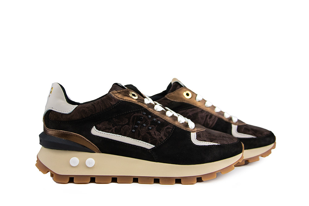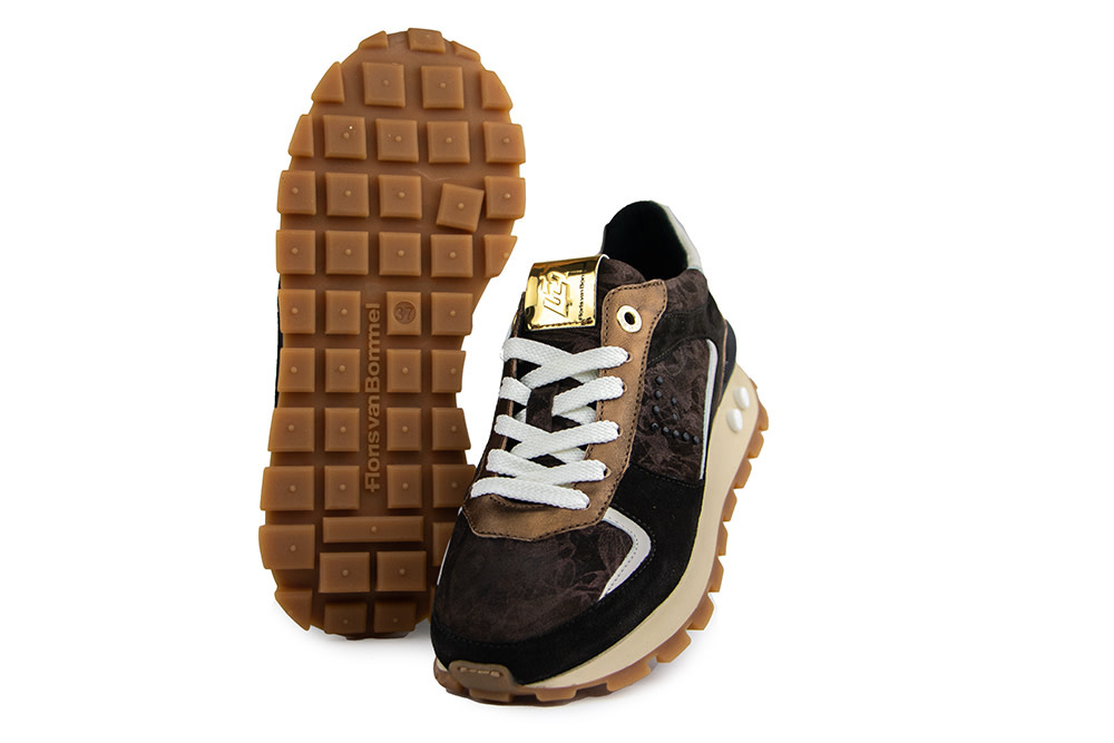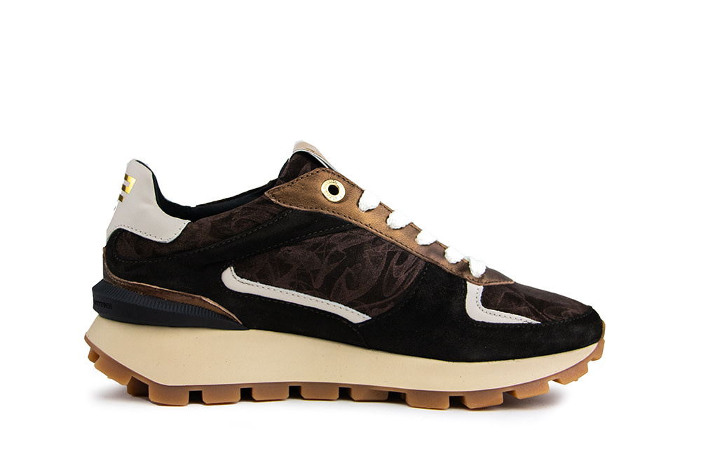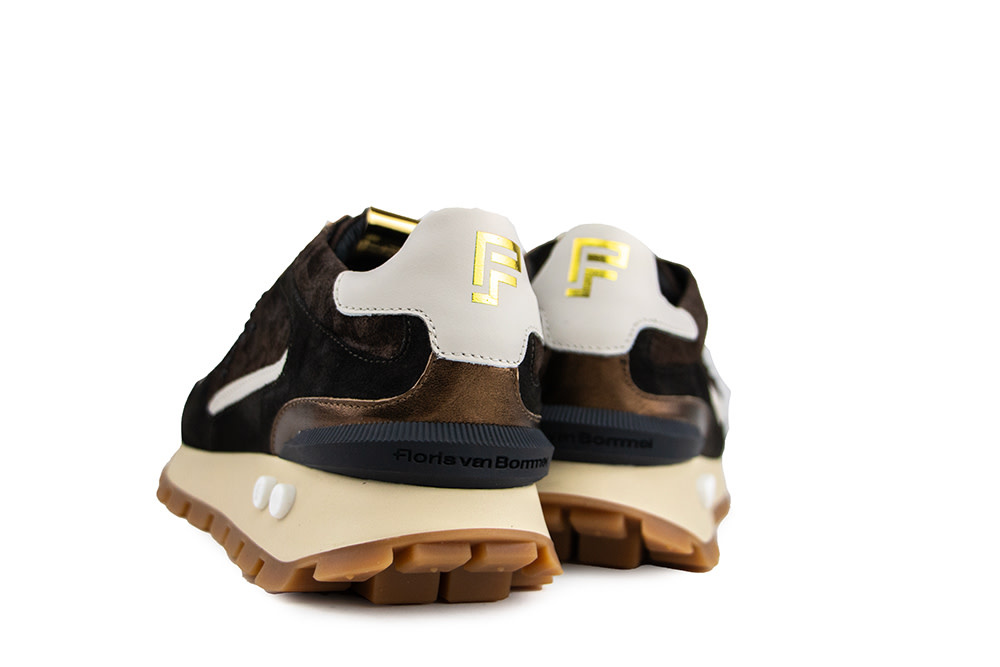The Floris van Bommel Blokki 05.07 women’s sneakers strike the perfect balance between bold design and refined details. Crafted from dark brown suede, they feature crisp white leather accents on the side and heel, bronze elements, and a unique metallic print across the upper and side. The studded F on the side and golden logo detail on the tongue add a modern, luxurious twist.