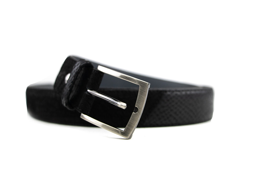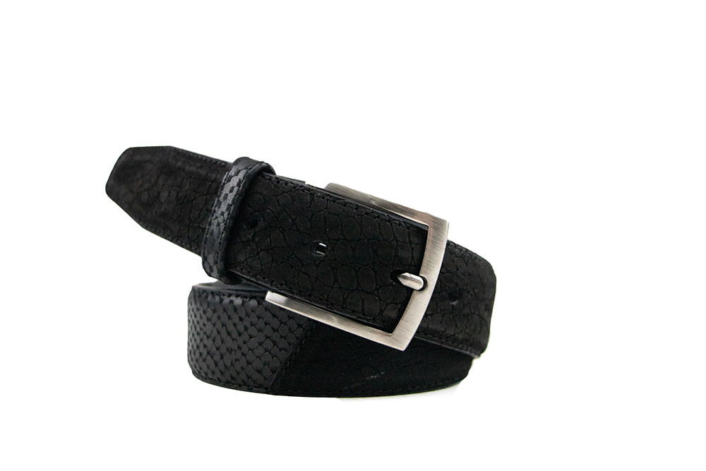 The black suede Floris van Bommel De Belter 24.82 men’s belt is a stylish accessory that radiates elegance and sophistication. Featuring alternating embossed prints, a gray leather lining, and a matte buckle, this belt offers a unique yet timeless look. It can easily be adjusted to your size and pairs perfectly with the matching Floris van Bommel shoes, completing your outfit with refined detail.