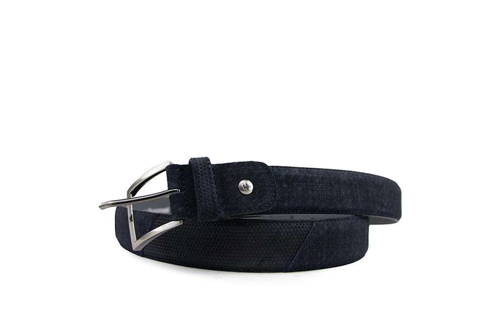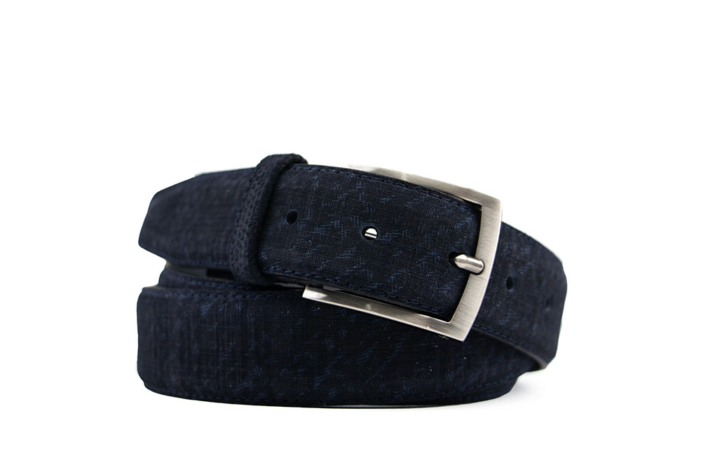 The dark blue suede Floris van Bommel De Belter 24.83 men’s belt is a refined accessory with a touch of luxury. Crafted with alternating embossed prints and a subtle color gradient, it offers a unique and stylish look. Finished with a gray leather lining and a matte buckle, this belt is modern yet timeless. It can easily be adjusted to your size.