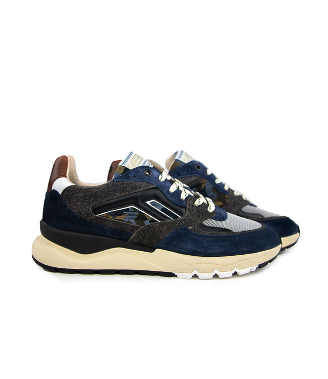 This Floris van Bommel De Treener 01.21 is a sneaker for men who dare. The dark blue suede base is powerfully complemented by gray accents and a striking army-printed textile on the side and tongue. The large black leather F logo on the side gives it that distinctive Floris signature, while the cognac leather heel area and colorful sole provide a surprising contrast.