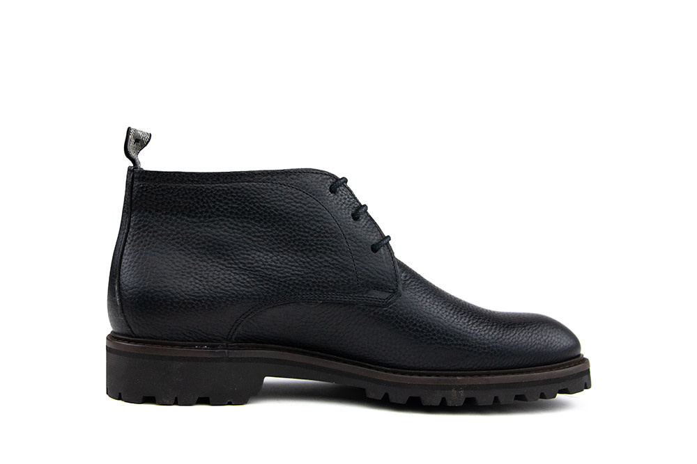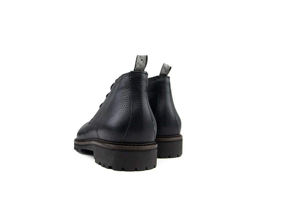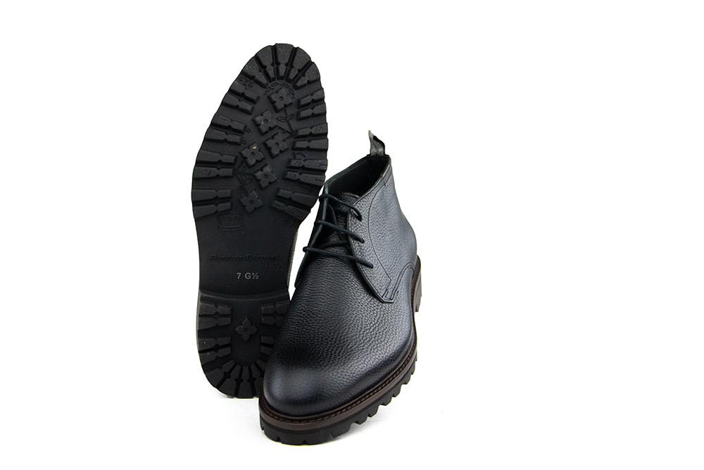 These black leather Floris van Bommel Sturdi 01.34 men's lace-up boots combine a rugged, robust look with a touch of refinement. The leather features a subtle print, adding a stylish twist to the classic boot design. The chunky lug sole offers both extra grip and a powerful appearance. A practical textile pull tab on the heel makes them easy to put on, while the leather lining and removable insole ensure lasting comfort.