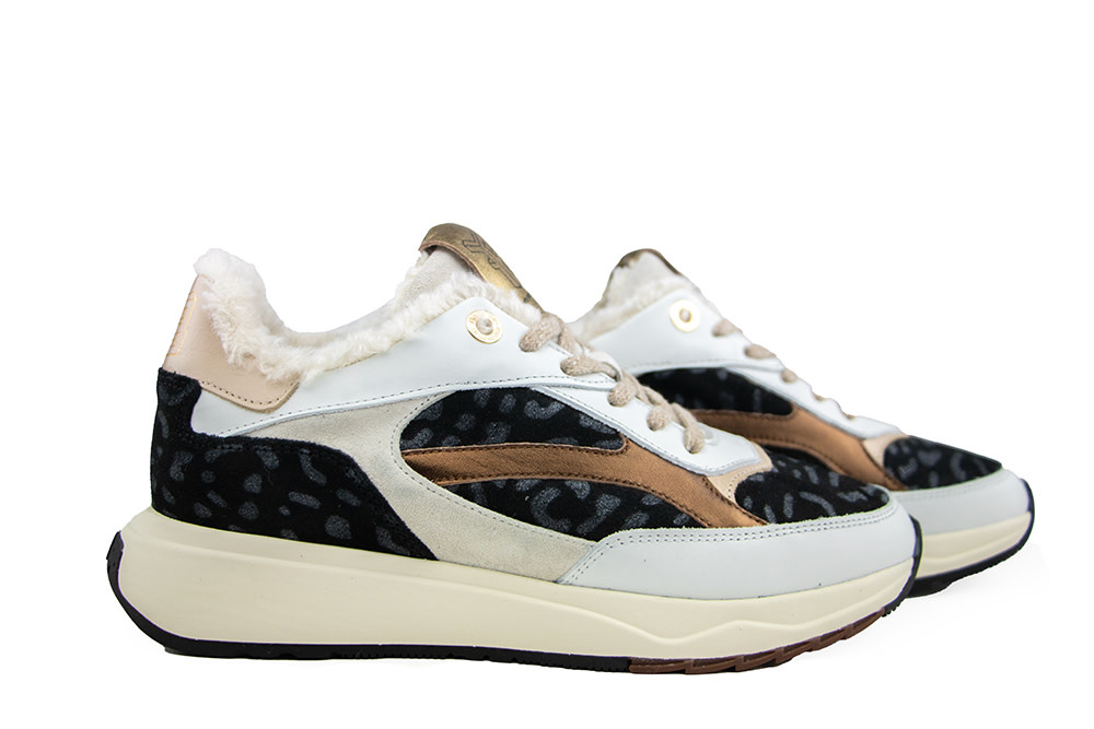 The Floris van Bommel Suvi 02.10 sneakers are a perfect mix of chic and sporty. Crafted from white leather with a black suede base featuring a unique print, these sneakers make a stylish statement. The metallic bronze leather panel on the side and beige accents on the instep and heel add a fashionable touch. The soft faux fur lining keeps your feet warm and cozy, making them perfect for cooler days. Finished with a clean white midsole and a metallic gold logo tag on the tongue. Designed in a G-width for extra comfort and a perfect fit.
