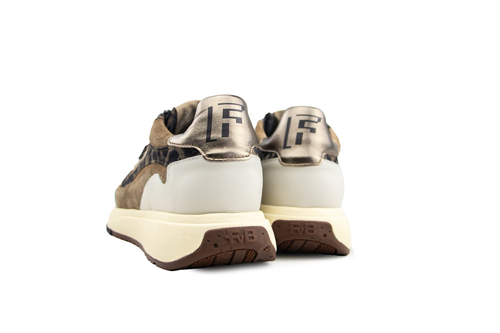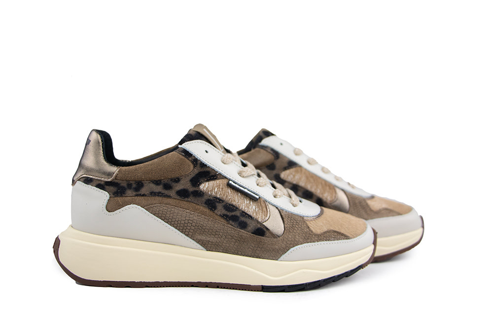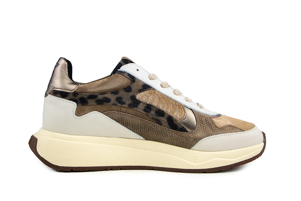 The Suvi 03.04 sneaker by Floris van Bommel brings together elegance and edge in one unique design. Crafted in soft taupe suede with a refined pattern, these sneakers feature pony hair details on the instep and side, plus leopard print touches on the tongue and side panel for a wild twist. Metallic taupe leather on the heel and beige leather overlays complete the elevated look.