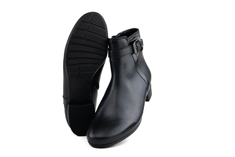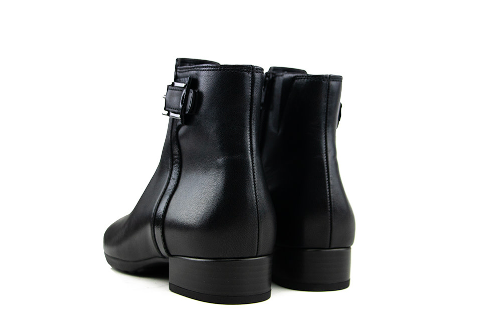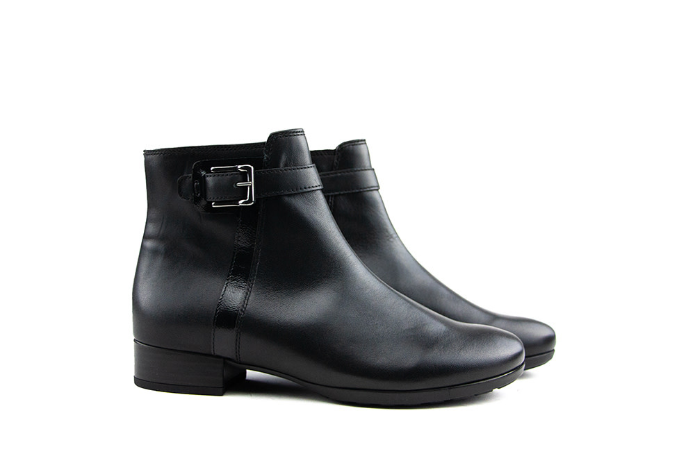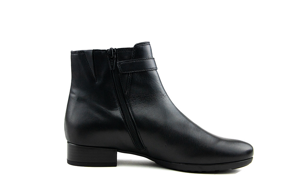 These elegant Gabor ankle boots perfectly combine comfort and style. The black leather features a sleek patent leather trim on the side and a narrow buckle as a subtle design accent.