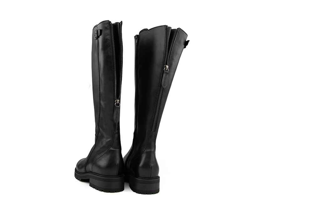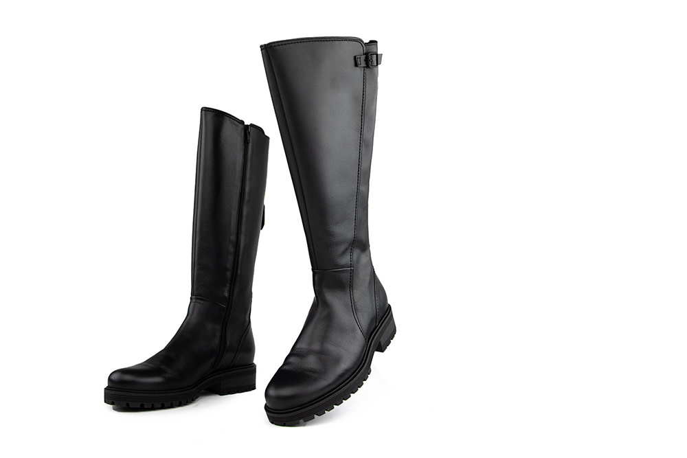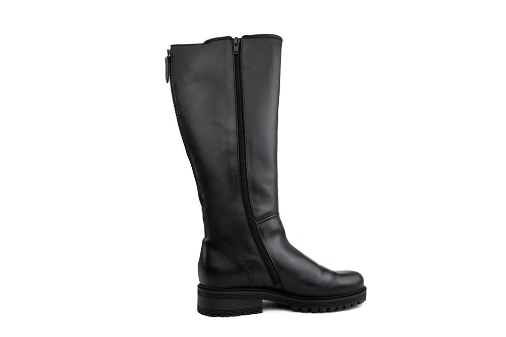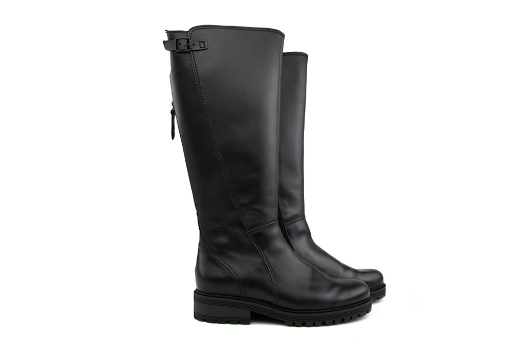 Stylish, sturdy, and timeless, these black leather Gabor boots combine comfort with elegance. The slightly wider shaft and narrow side buckle add subtle detail, while the back zipper provides extra room. Refined stitching details complete the sophisticated look.