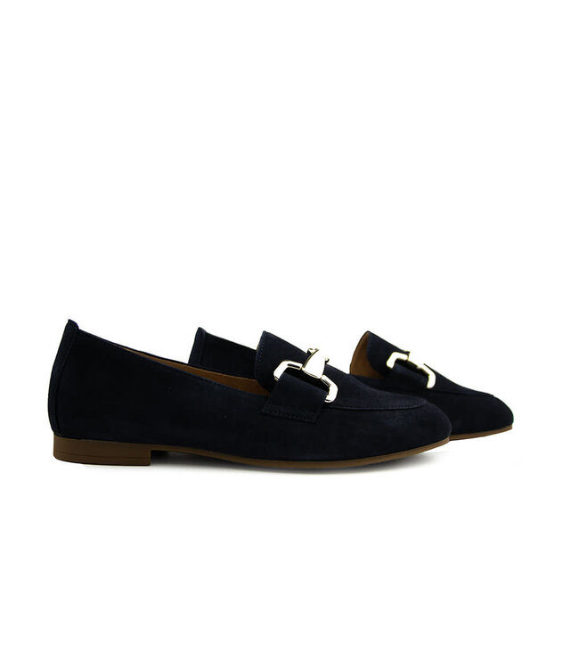 These dark blue suede Gabor women’s loafers offer a timeless and classic look. The rich blue colour gives the loafer an elegant appearance, while the silver-toned bit detail across the vamp adds a refined accent. The clean, classic silhouette makes these loafers easy to style with both smart and casual outfits.