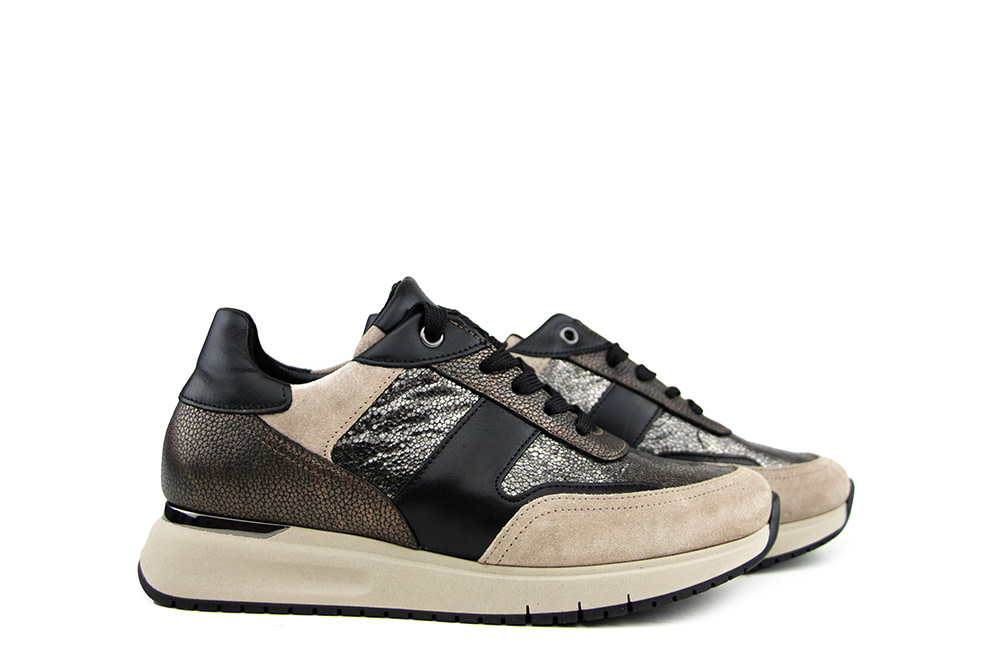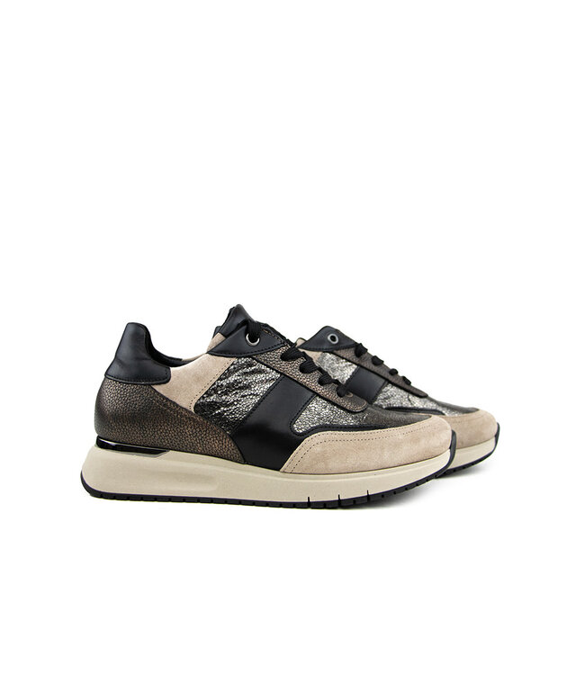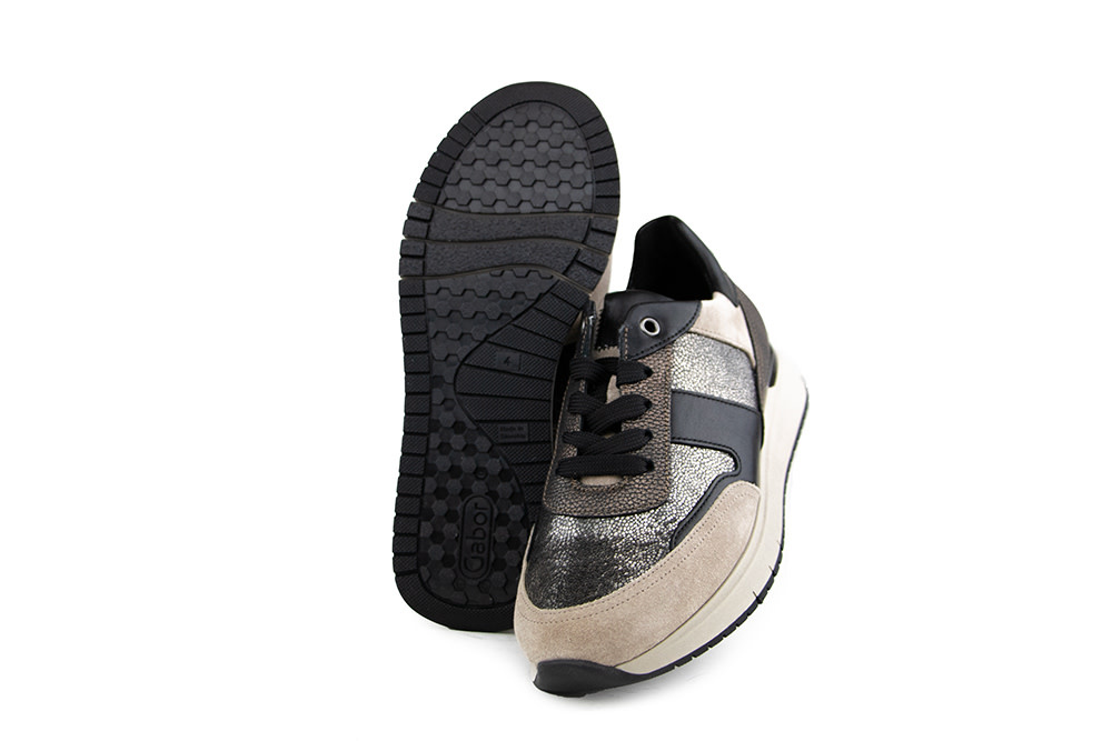 These unique Gabor sneakers combine a variety of premium materials and tones for a chic, modern look. The silver leather base with a metallic finish and subtle print contrasts beautifully with the brown leather panels and taupe suede accents. The bronze leather heel and lace area, both with a metallic sheen and print, add a touch of luxury.