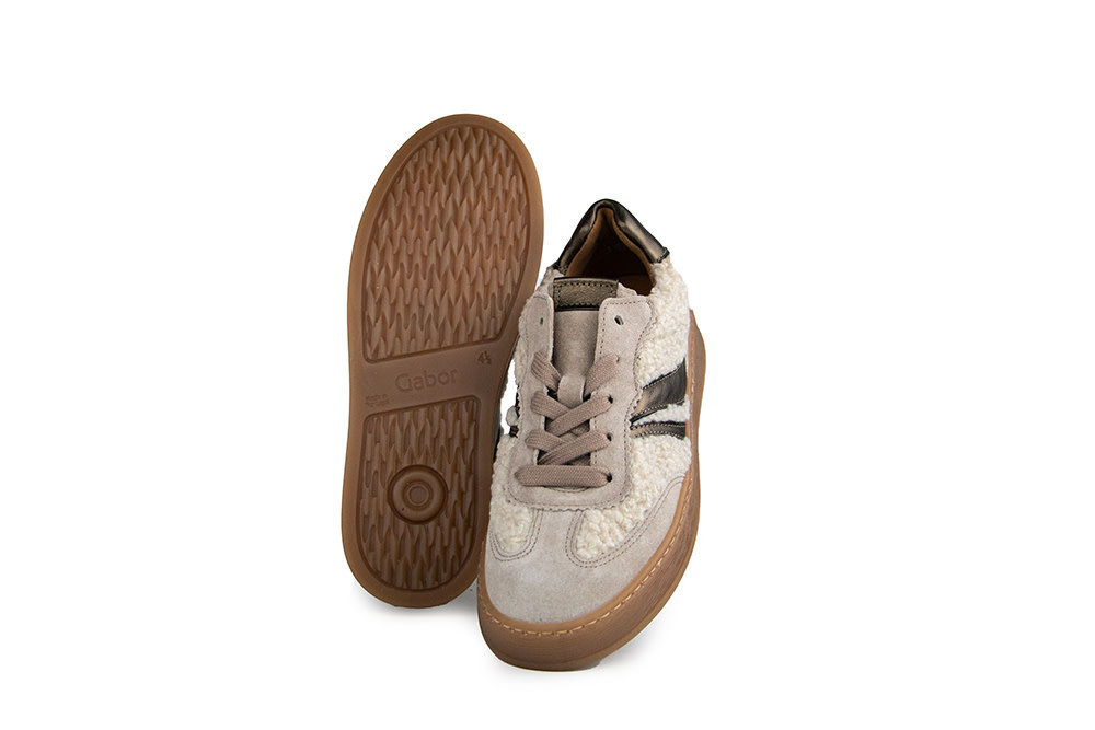 Stylish and comfortable at the same time! These taupe gray suede Gabor sneakers are a real eye-catcher thanks to the bronze-colored accents on the side, tongue and heel. The soft fur accents give them a warm, cosy look - perfect for autumn.