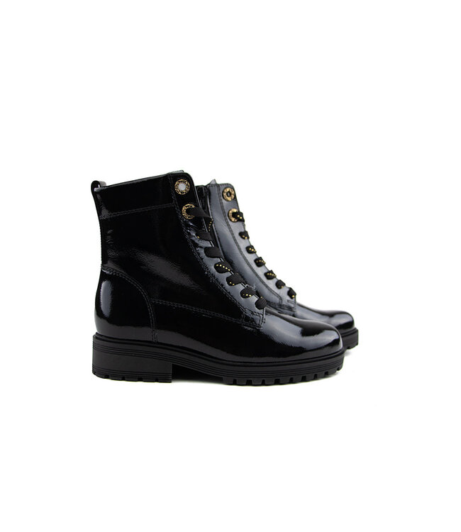 These elegant Gabor lace-up boots offer the perfect blend of classic style and all-day comfort. Crafted from black patent leather, they feature delicate stitched detailing and wide laces with subtle gold accents. Two uniquely shaped lace eyelets add a special touch.