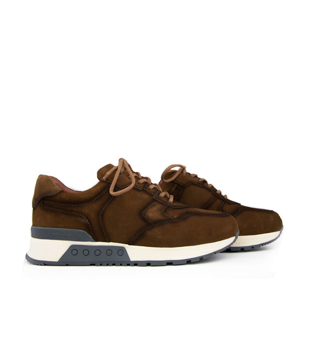 Dark cognac suede Greve sneakers for sporty men. They have a fantastic color gradient, striking stitching lines and light laces. Other nice details are the rubber attachment on the heel, the leather attachment on the tongue and the cream sole with black insert. The padded elements and fine fit make these sneakers super comfortable on the feet.