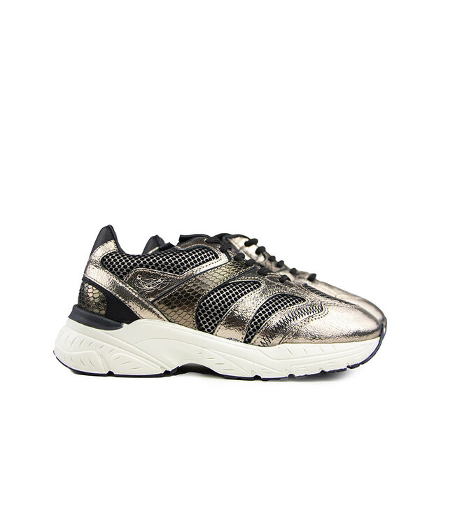 These metallic bronze leather HIP sneakers are true showstoppers! The black textile base with metallic print adds a cool, shiny look, while the black leather heel cap and subtle print details give them a trendy, premium vibe. The contrasting beige runner sole keeps them sporty and fresh.