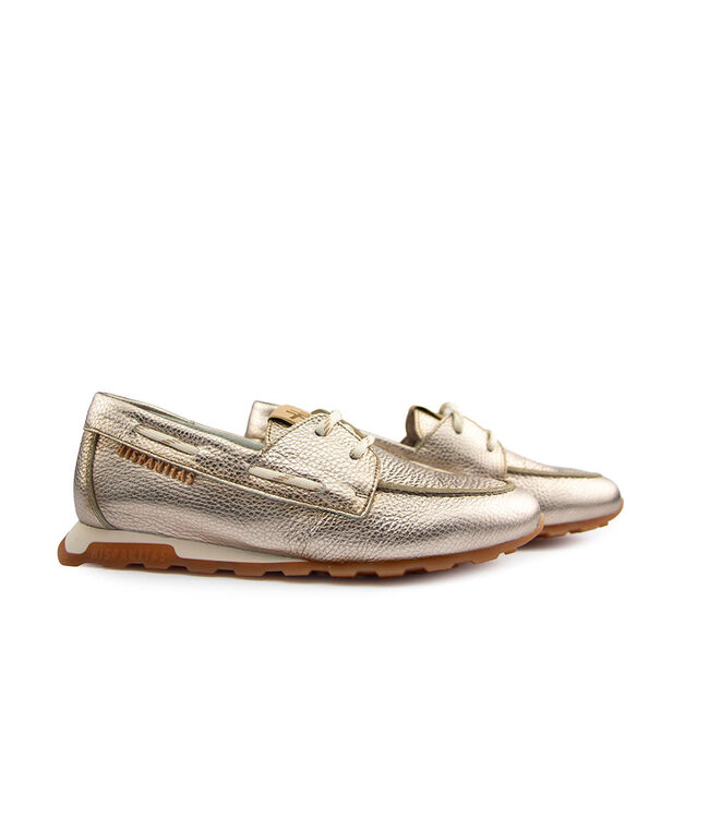 These metallic light gold Hispanitas Zinnia lace-up shoes are the perfect blend of a sturdy boot and a sleek lace-up shoe. The metallic leather gives them a modern, shimmering look, while the light laces and signature mirror stitch add stylish, refined details. The chunky sole provides a sporty touch and excellent grip with every step.