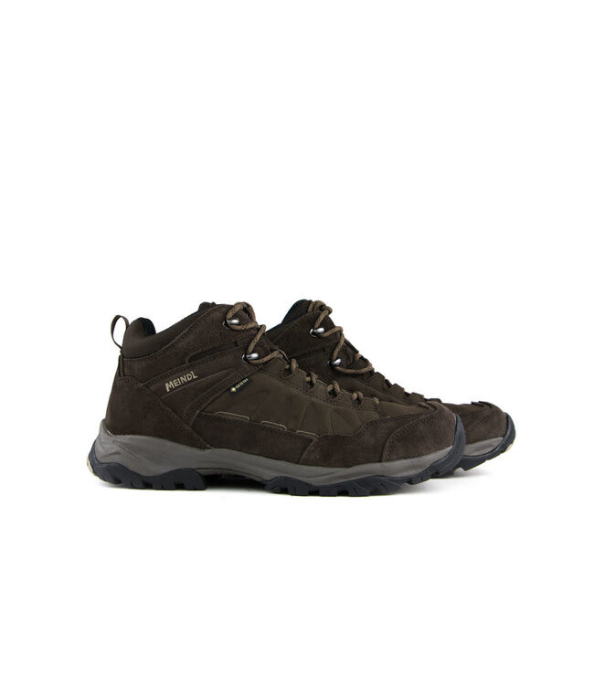 Brown suede Meindl lace-up shoes for sporty men. They have raised lines on the side, a layered design, multi-colored laces, and distinctive lace hooks. You slip the shoes on easily with the loop on the back. With a sturdy profile sole, padded elements, and a good fit, the lace-up shoes sit great on your feet. Hiking shoes are timeless. Take them to the mountains in the summer or walk through the woods in the fall.