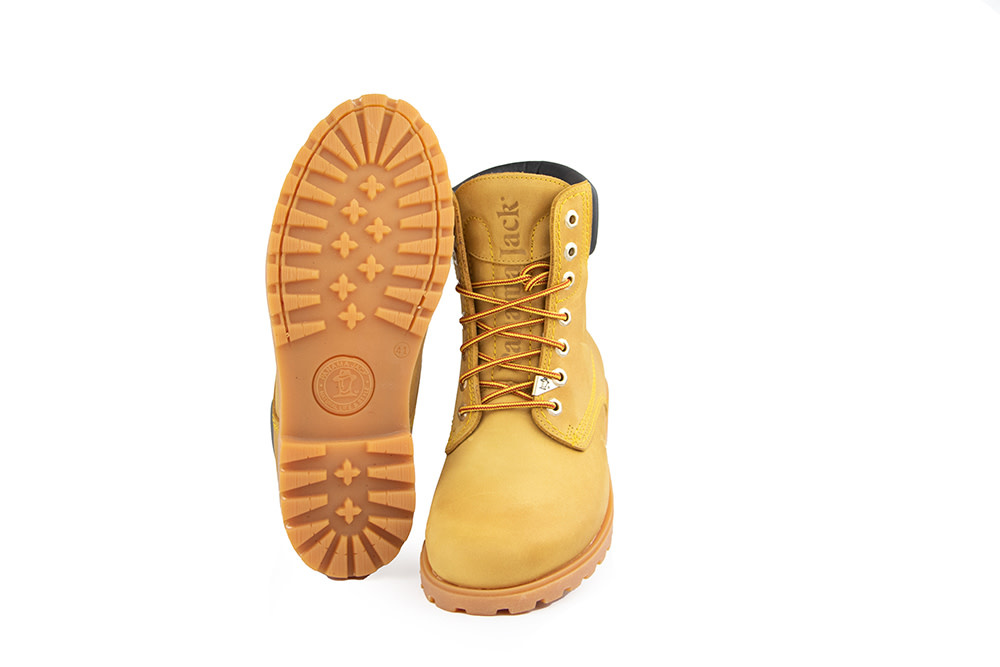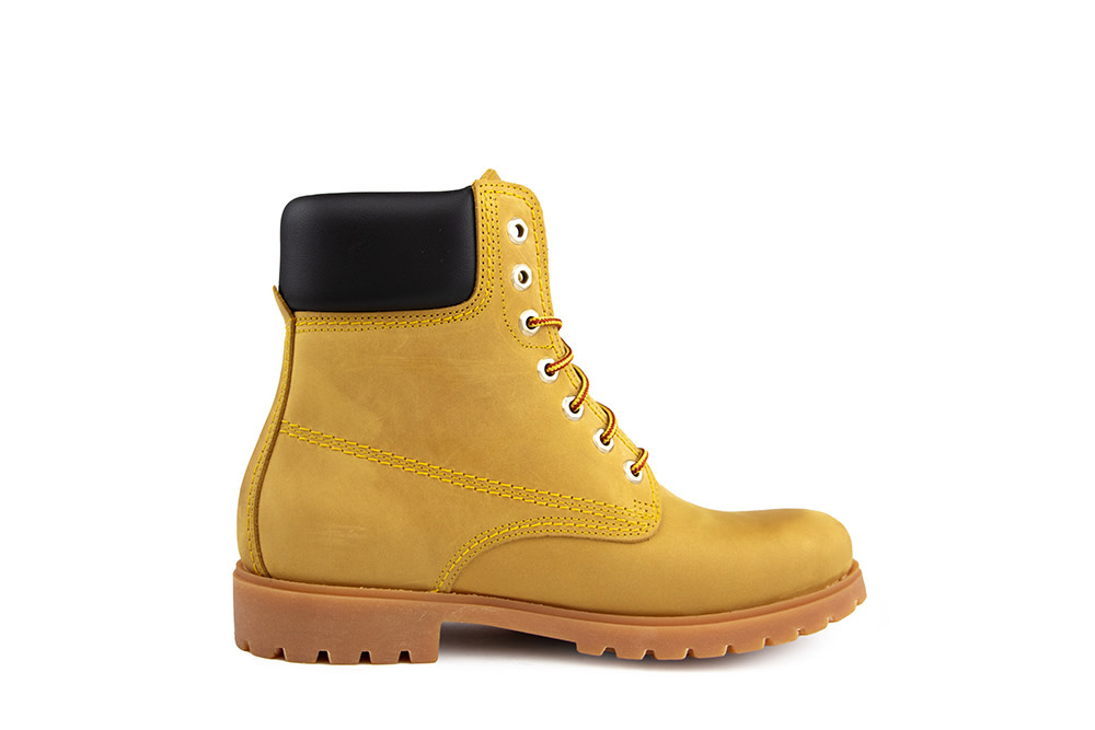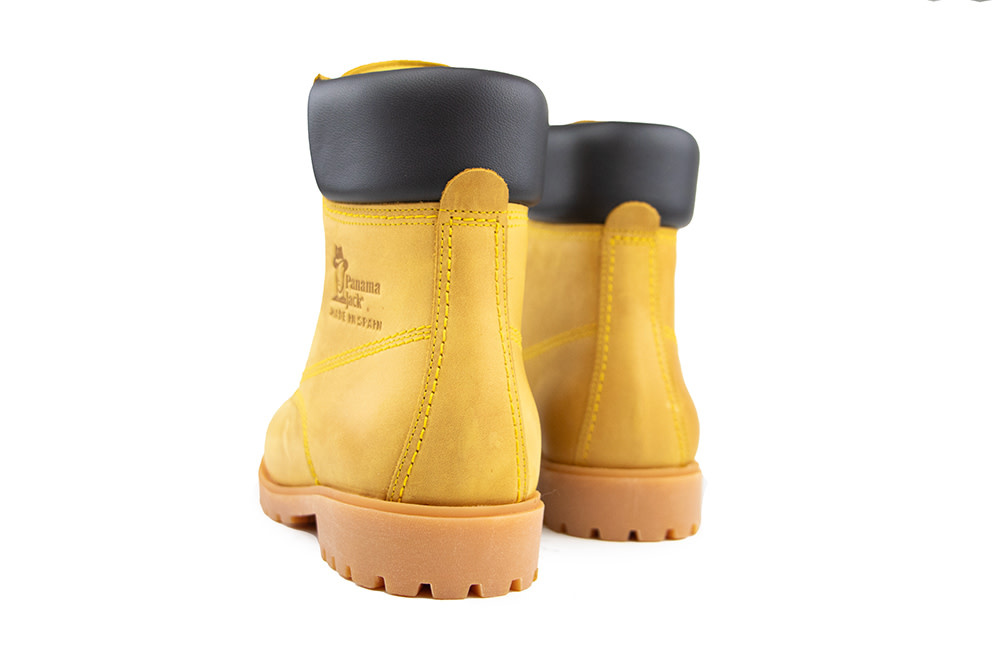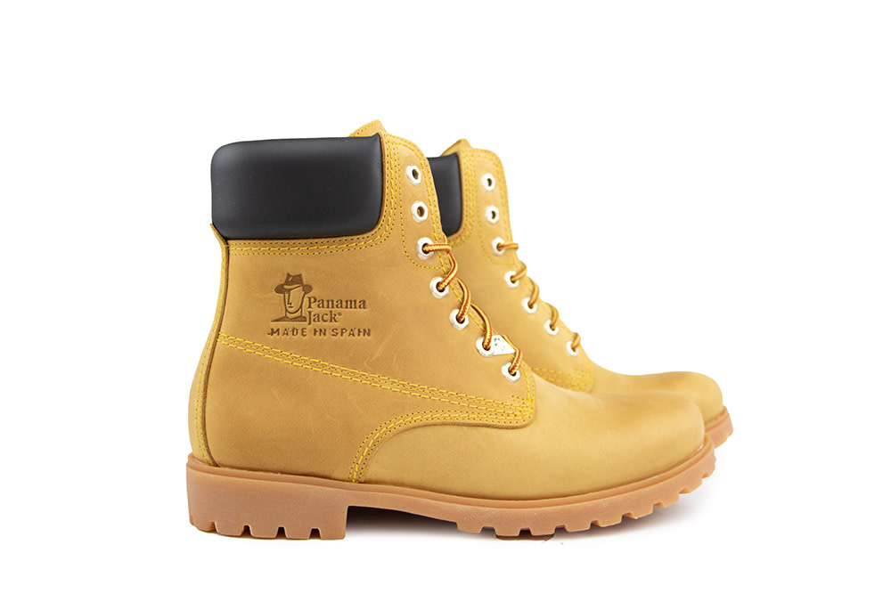The Panama Jack Panama 03 C1 boots in yellow nubuck perfectly blend rugged style with practical comfort for the modern man. The warm yellow nubuck is complemented by a brown padded leather collar and multi-colored laces, giving the boots a playful yet stylish look. Distinctive eyelets and fine stitching along the sides add a unique touch, while the sturdy rubber tread provides grip and durability. Subtle logo accents complete the design. With a comfortable fit and reliable sole, these boots are ideal for both casual outings and active workdays.