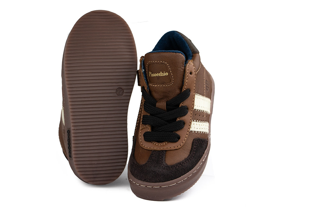 These high-top sneakers by Pinocchio are a real eye-catcher for active kids! Made from mid-brown leather with a dark brown suede toe and a cognac suede heel, they have a tough and stylish look. The brown leather heel panel and off-white leather side stripes with bold stitching add a trendy touch.