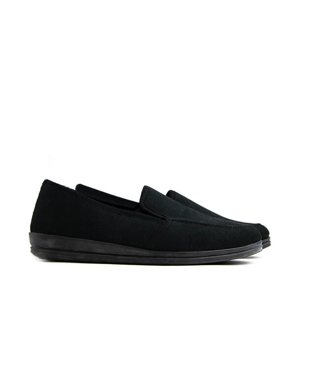 Lovely black Rohde slippers for around the house! The slippers are made of black natural textile with elastic inserts on the sides. The lining is made of natural textile, and the sole is rubber. A nice detail is the stitched toe!